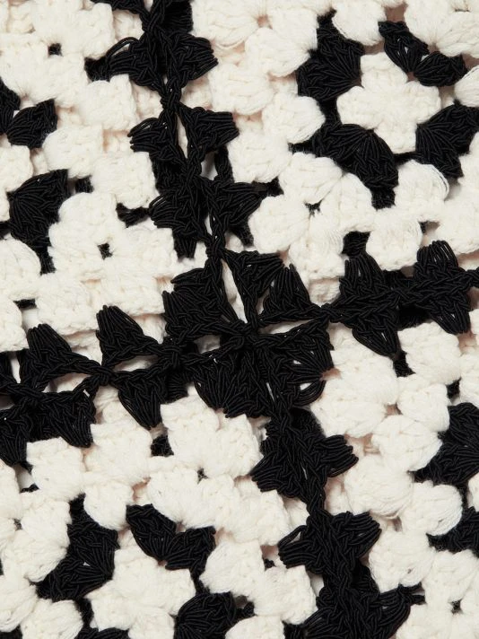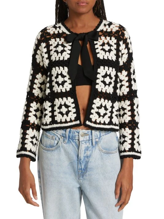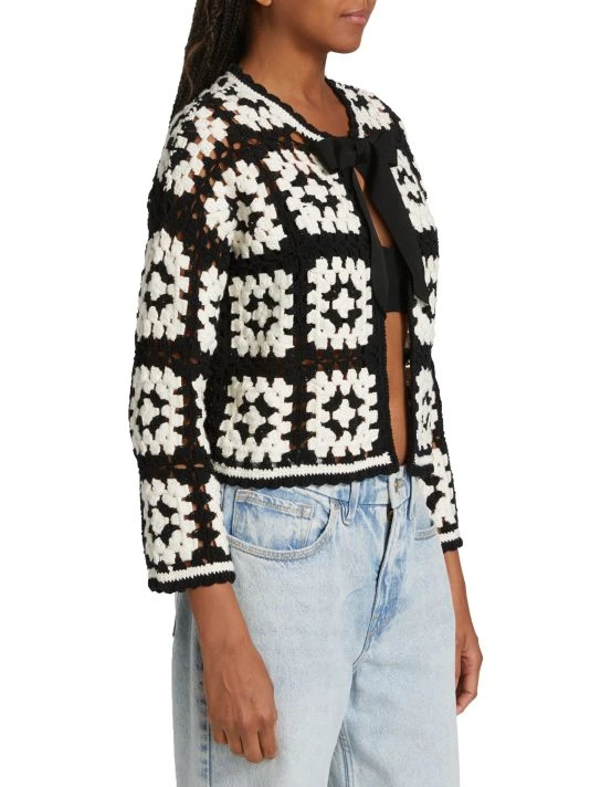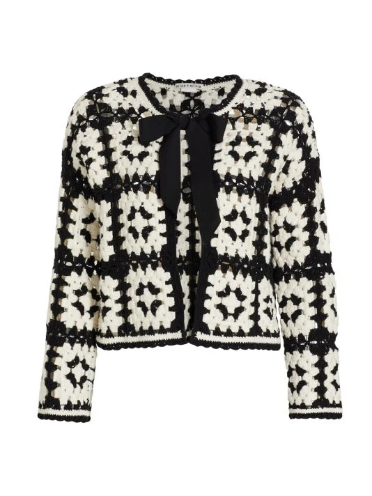 The Anderson cardigan from Alice + Olivia is crafted of crochet squares with a bow tie-front.