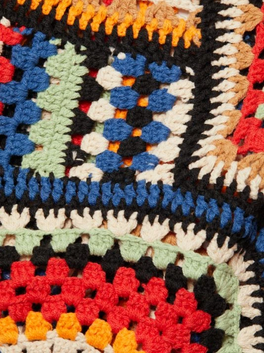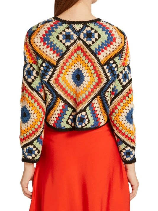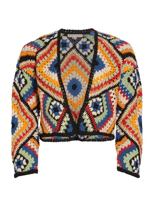 Cut in a boxy silhouette, this cropped crochet cardigan is complete with solid trim and a single front-button closure.