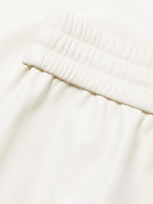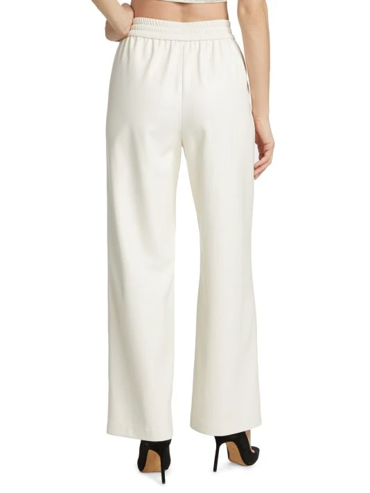 Alice + Olivia’s Benny pants are cut in a wide-leg silhouette. A vegan-leather front contrasts a crepe back, offering unique styling.