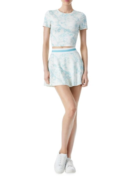 Cut in a trapeze silhouette, Alice + Olivia’s Blaise miniskirt is elevated by a striped banded waist and contrast painterly prints.