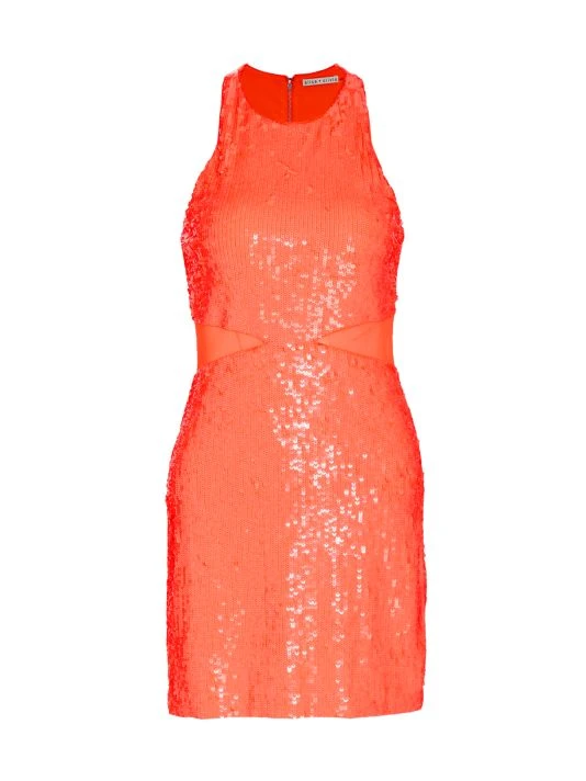 Decorated with sparkling sequins, Alice + Olivia’s Cara minidress is detailed with a round neck and mock cut-out waist with tonal paneling.