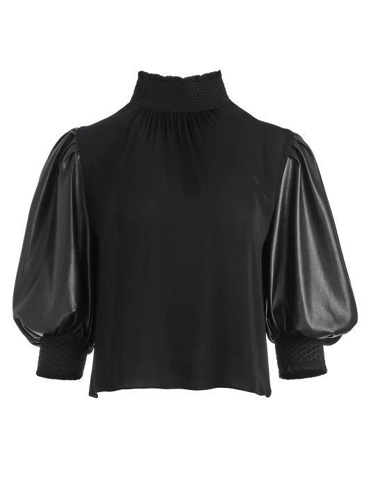 Billowy top adorned with faux leather puff-sleeves, trimmed with smocked detail.