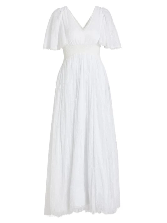 Alice + Olivia’s romantic Charlsie maxi dress flaunts a smocked waist, short flutter sleeves, and lace details.