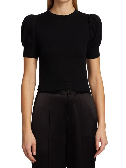 A removable eyelet collar tops this sweater top, designed with feminine puff sleeves.