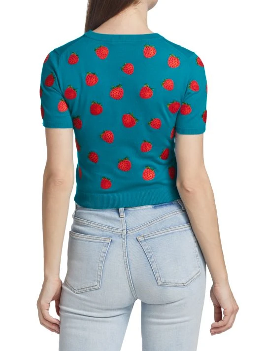 Alice + Olivia’s Ciara sweater is detailed with embroidery strawberries in a cropped fit.