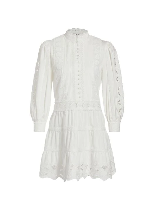 Crafted of cotton, Alice + Olivia’s Clark minidress is embellished with an inset lace detail and floral eyelet trim. A stand collar, pintuck detailing on the bodice, and a tiered hem finish the look.