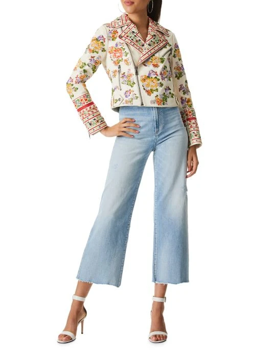 Crafted of lamb leather, Alice + Olivia’s Cody moto jacket features a notched collar and front zip pockets. This cropped style is complete with floral embroidery and beaded adornments.