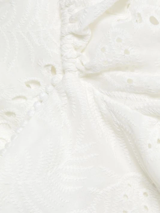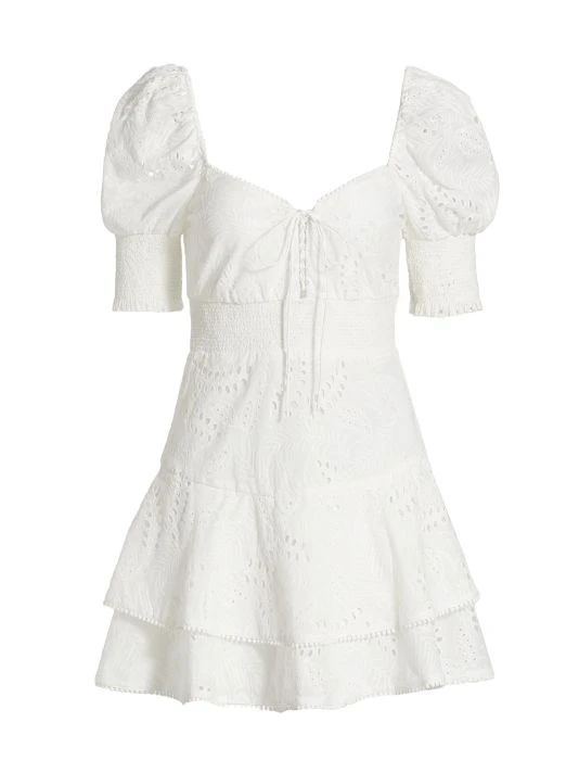 ONLY AT SAKS. Paisley eyelet adds charm to this pom-pom trimmed smocked mini dress.