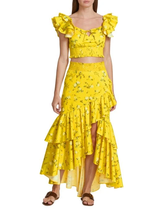 Crafted of a cotton blend, Alice + Olivia’s Cristina floral-print midi-skirt features a wrap-effect silhouette with a smocked waist and cascading ruffles.