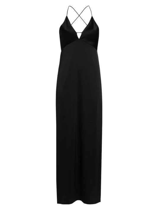 Satin maxi dress with sleek cross back featuring a long side slit and satin finish.