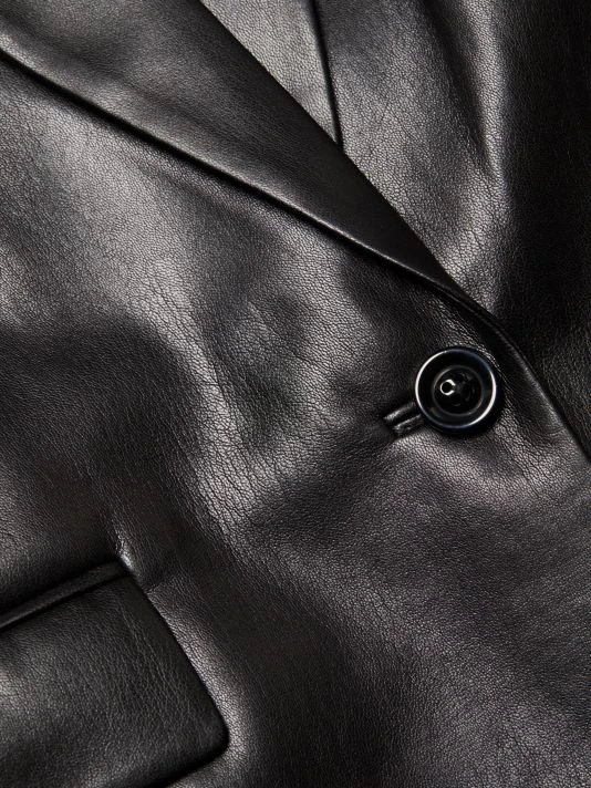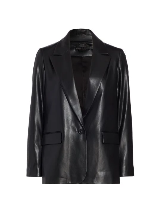 Designed in a structured silhouette with notched lapels, Alice + Olivia’s Denny blazer is crafted of vegan leather. This piece is fastened by a single button closure.