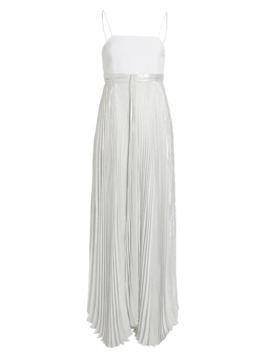 The Despina maxi dress from Alice + Olivia features a metallic pleated skirt with a flowing handkerchief hem. A fitted straight-neck bodice with delicate spaghetti straps completes the look.
