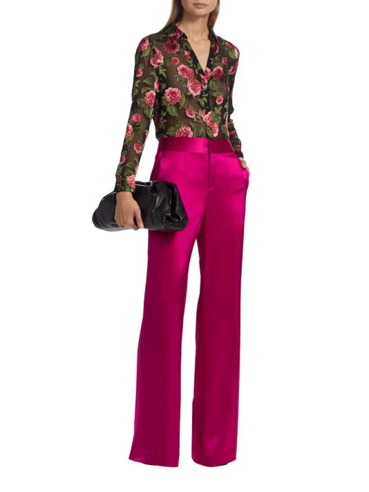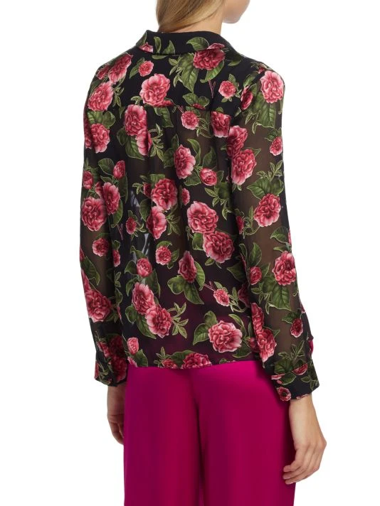 Alice + Olivia’s Eloise blouse is crafted of a semi-sheer silk blend. This button-front style is adorned with a vibrant floral print.