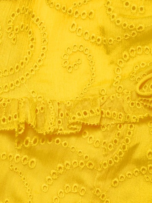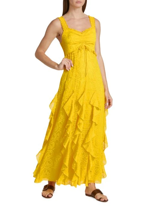 Swirly jacquard lends style to Alice + Olivia’s empire-waist dress, designed with playful ruffled trim.