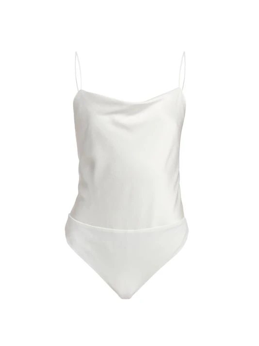 The Harmon bodysuit from Alice + Olivia features a satin bodice with a cowl neck and delicate spaghetti straps. This pull-on style is finished with a back zip closure.