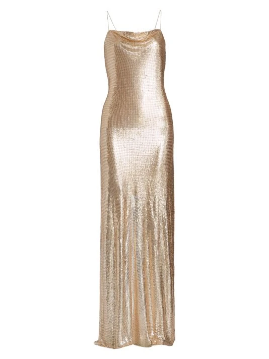 The Harmony maxi dress from Alice + Olivia is crafted of goldtone chainmail for a figure-skimming, liquid effect. An elegant open back with cross-back straps and a cowlneck complete this slip-style silhouette.