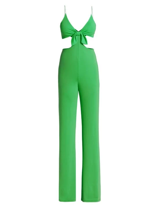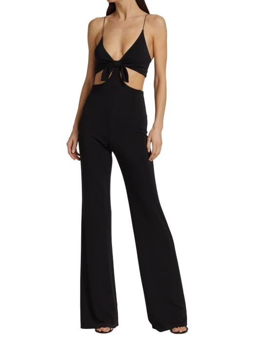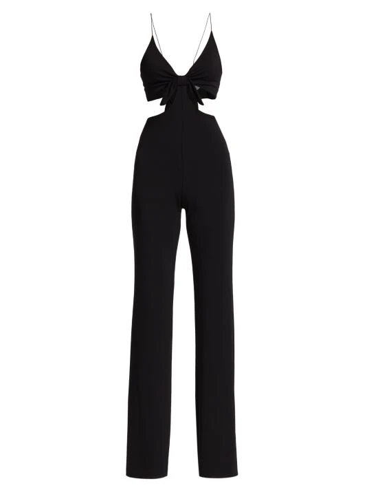 Made of form fitting stretch-fabric, the Havana jumpsuit is detailed with a cut-out waist and center front bow.