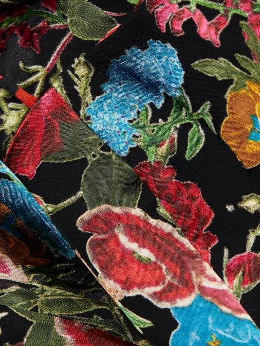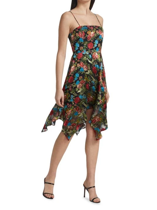 The Heather dress is made of floral fabric with an asymmetric handkerchief skirt.