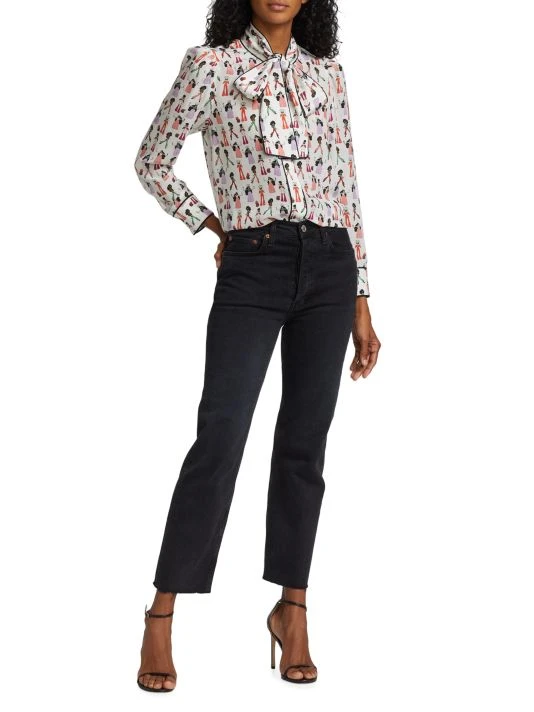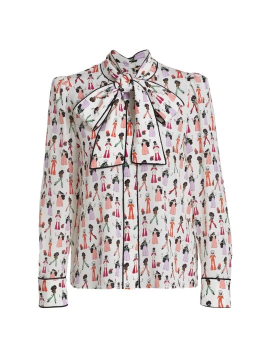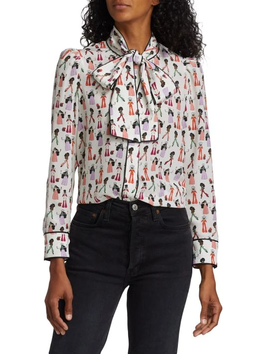 The Jeannie blouse from Alice + Oliva is crafted of pure silk in a playful chef print. A tieneck and contrast piping finish this polished style.