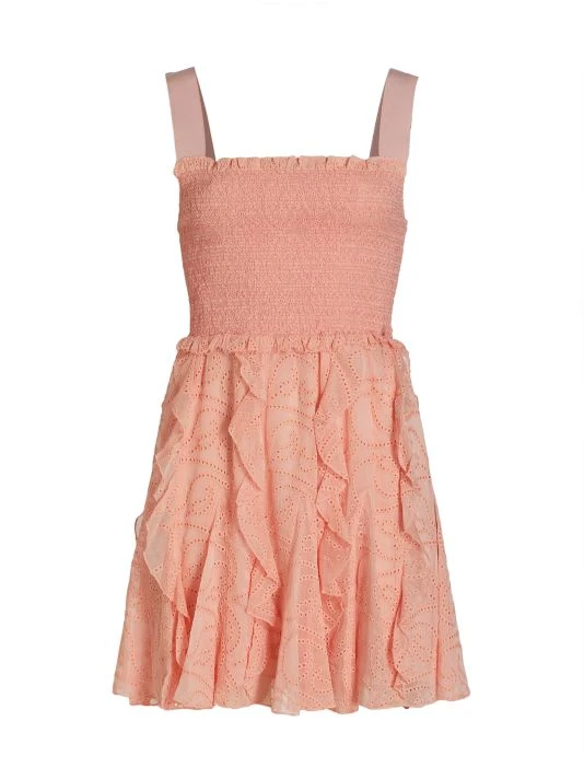 Evoking a playful style, this Alice + Olivia Jocelyn minidress features a fitted smocked bodice transitioning into a ruffle eyelet skirt.
