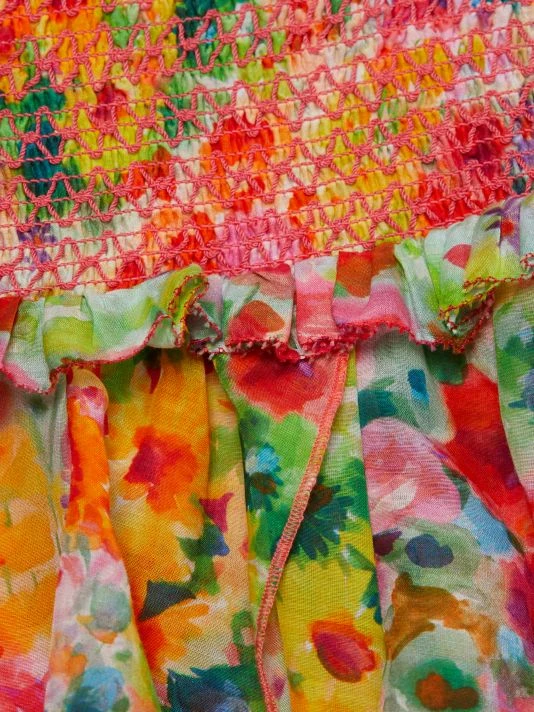 Boasting a colorful floral print, Alice + Olivia’s Jocelyn minidress features a smocked square-neck bodice with ruffled trim. An A-line skirt with flowing vertical ruffles completes this bright style.