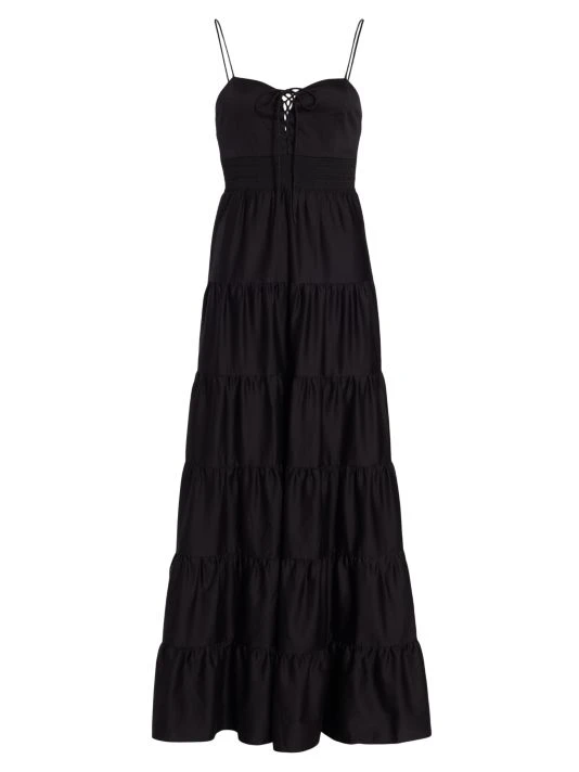 Crafted of a cotton blend, Alice +Olivia’s Jori maxi dress is detailed with a lace-up bodice, a smocked waistband, and a tiered skirt.