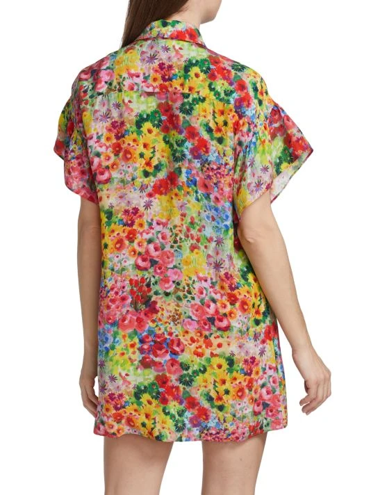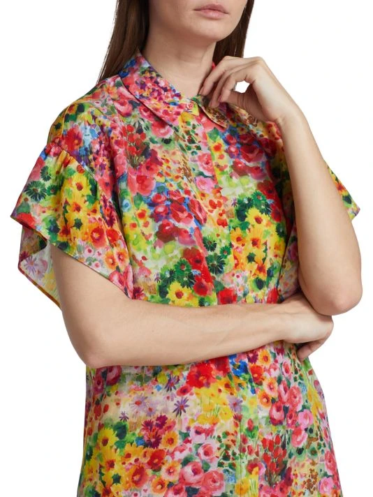 Alice + Olivia’s Jude shirtdress showcases a vibrant painterly floral print and is styled with flutter sleeves, a spread collar, and a relaxed shift silhouette.
