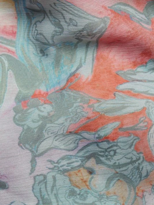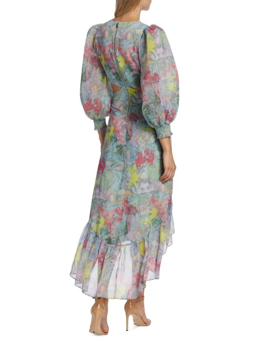 Alice + Olivia’s Katia midi-dress is adorned with a multicolored abstract print. Designed with a high-low hem, this alluring piece is complete with a plunging V-neckline, cut outs at the waist, and dramatic puff sleeves.