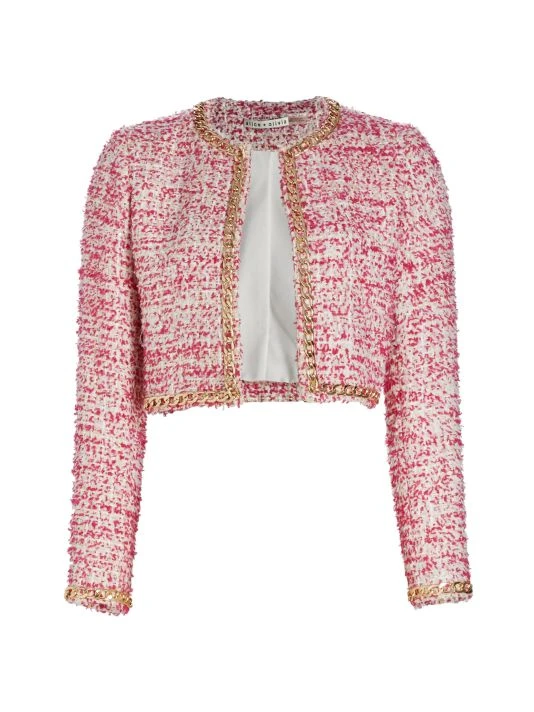 Alice + Olivia’s Kidman cropped tweed jacket features a round neck and an open front. Goldtone chain trim elevates this classic silhouette.