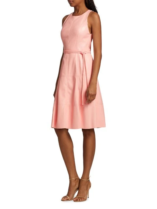 Crafted of vegan leather, Alice + Olivia’s Leandra midi dress is cinched with a long braided leather belt.
