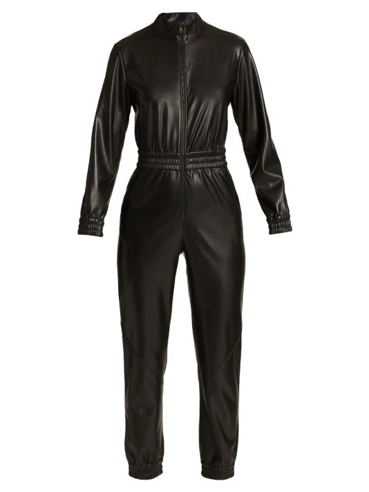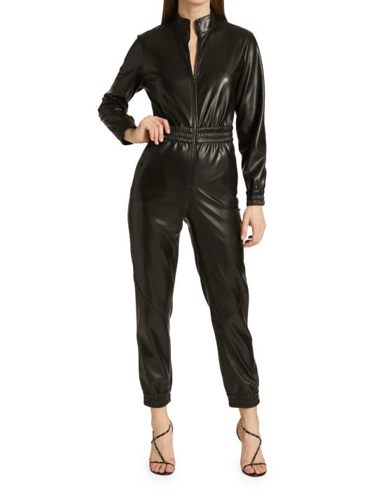 Constructed of lustrous vegan leather, this ankle-crop jumpsuit is enhanced by smocked, elasticized detailing.