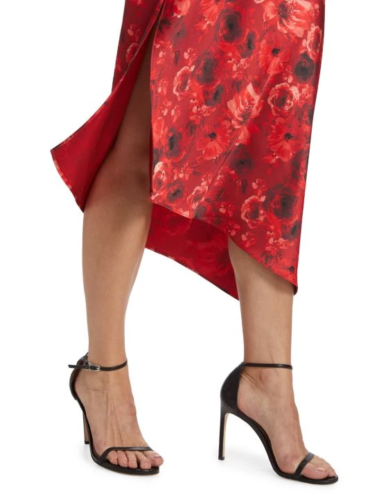 ONLY AT SAKS. Cut with an edgy asymmetric hem, Alice + Olivia’s Maeve midi-skirt boasts a slinky slip silhouette. This style is adorned with bright florals and features a side slit for added movement.