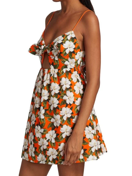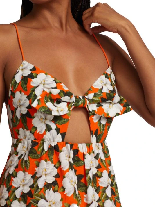 Crafted of a linen blend, the Melvina minidress from Alice + Olivia is styled with ultra-thin spaghetti straps, tie-front detail, and a center cutout.