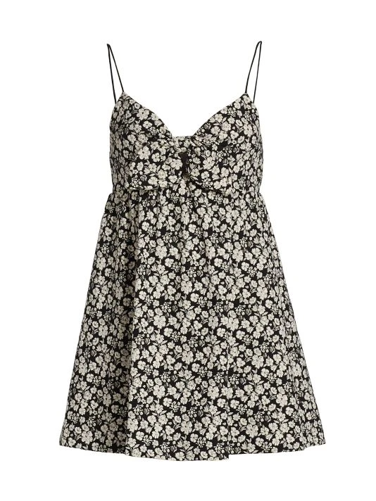 Flaunting a fitted bodice adorned with a bow, Alice + Olivia’s Melvina minidress is decorated in a beautiful floral print. This babydoll piece is enhanced with a cut-out bust.