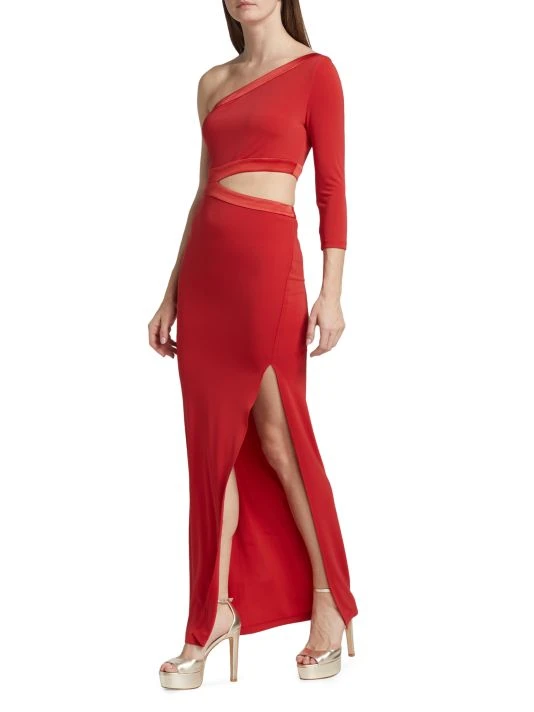 Cut in a one-shoulder silhouette, Alice + Olivia’s Michele gown is elevated by lustrous satin trim and a wraparound side cut out.