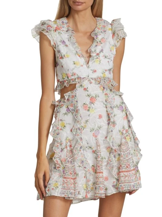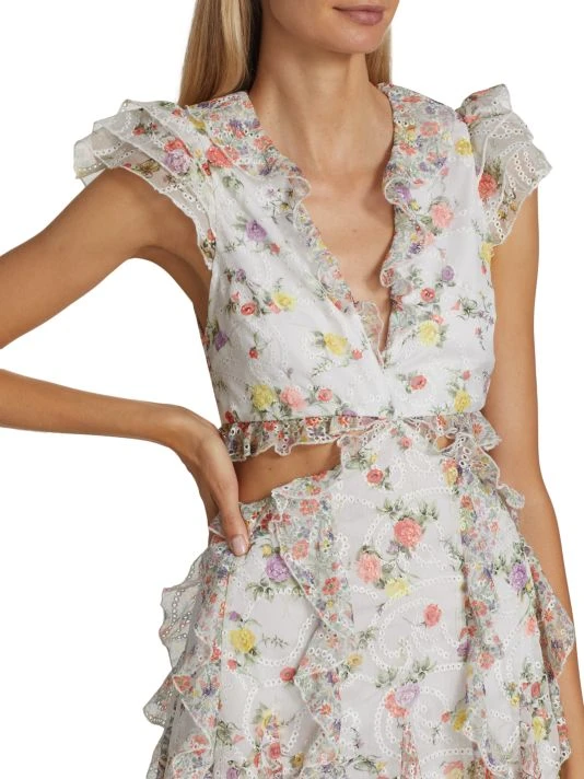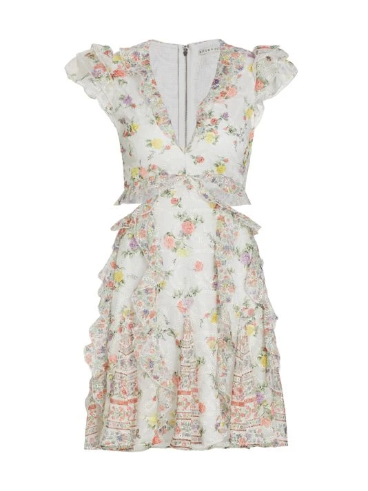 Made of floral printed ruffle fabric, the Mitzi minidress by Alice + Olivia is finished with a cut-out waistline.