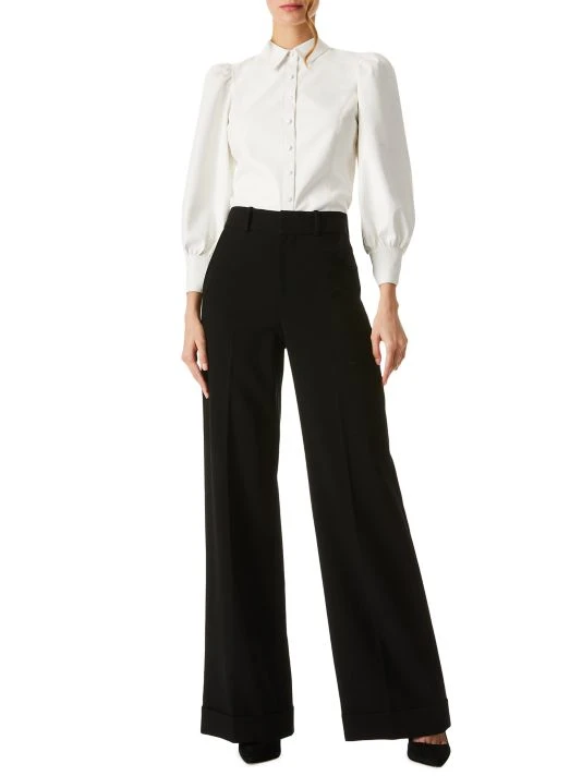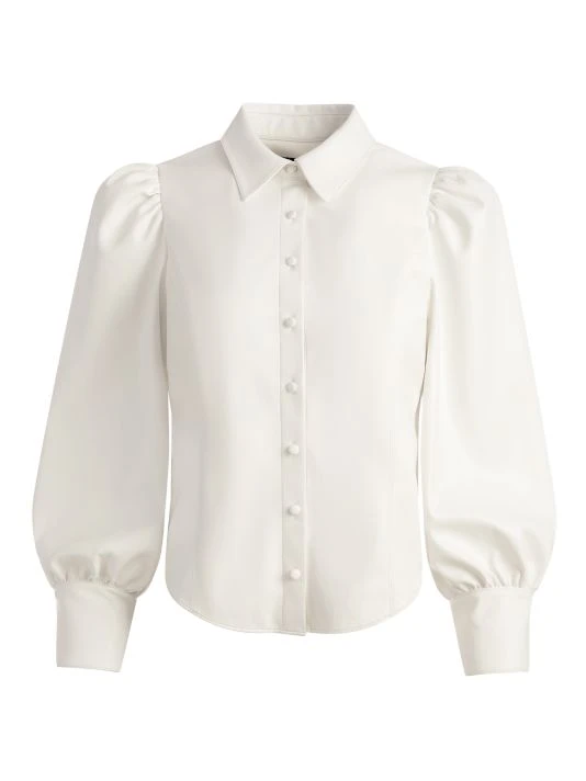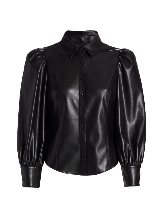 This classic button-front shirt is elevated with voluminous puff-sleeves and crafted of polished faux leather.