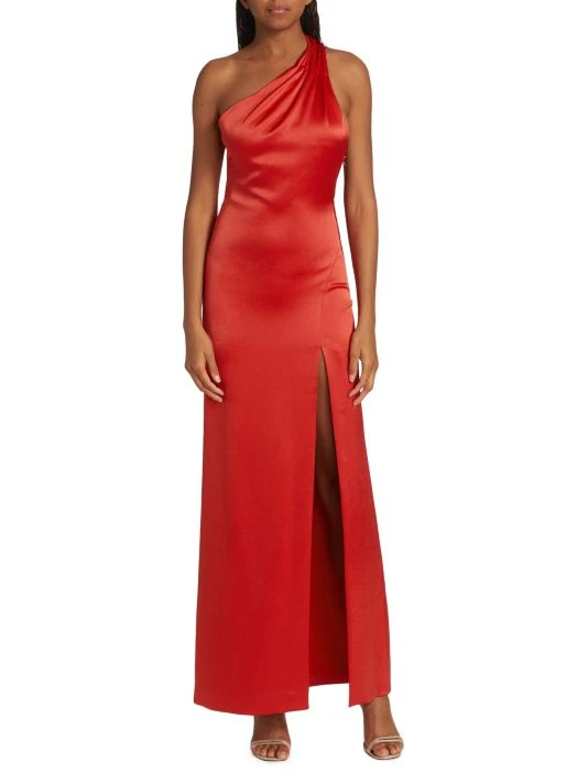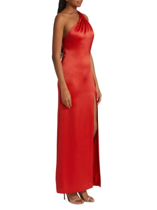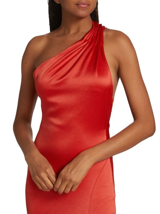 Crafted of smooth satin fabrication, the Paulette gown is designed in a fitted one-shoulder silhouette with a cut-out back.