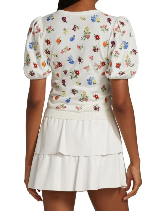 This whimsical top is embroidered with a charming floral motif, framed by puff sleeves.