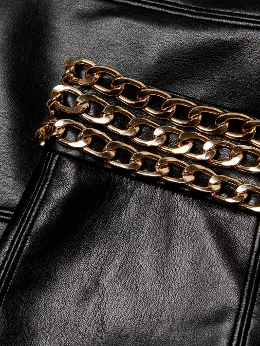 This chic miniskirt from Alice + Olivia boasts an edgy faux-leather design. Adorned with goldtone chains at the waist, this style evokes a moto aesthetic.