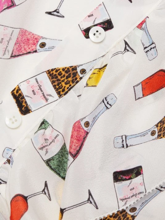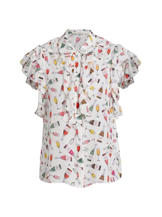 The Robbie button-front blouse from Alice + Olivia is crafted of pure silk in a playful wine bottle print. Ruffled shoulder details and a peter pan collar complete the look.