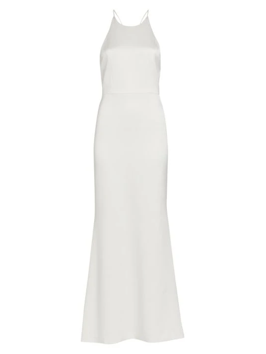 Alice + Olivia’s Samia gown is crafted of lustrous satin. Featuring a low back, this elegant style graces the body with a round neck, crossover spaghetti straps, and mini train detail.