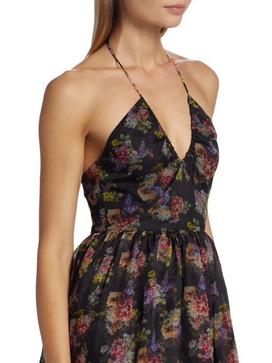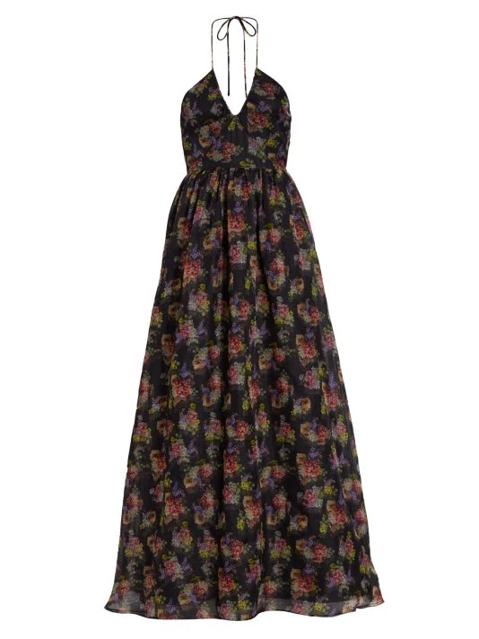 Crafted of silk, Alice + Olivia’s Saori princess gown is adorned with a playful floral print. This full-skirted style is complete with a plunging V-neck and a halter-tie.