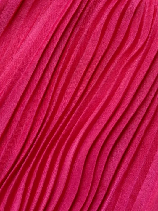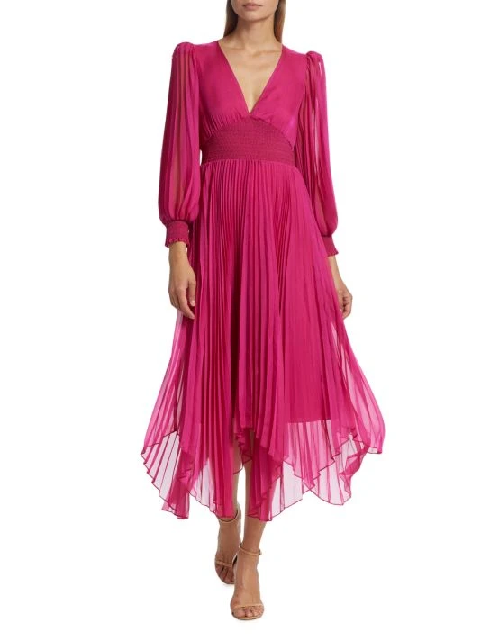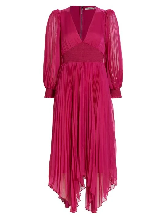 Cut in an asymmetric silhouette, Alice + Olivia’s Sion puff-sleeve midi-dress is elevated by plissé pleating and a smocked waist.