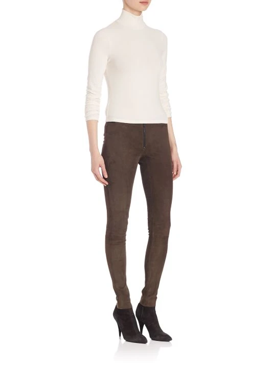 Plush suede articulated in a divine rocker-chic silhouette is extra-long and worn scrunched at the unhemmed ankle.