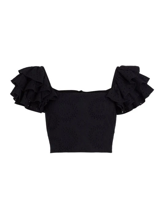 Crafted of cotton-linen blend eyelet lace, the Tawny top from Alice + Olivia features a fitted square neck bodice and a smocked back. Layered ruffled sleeves finish this cropped look.