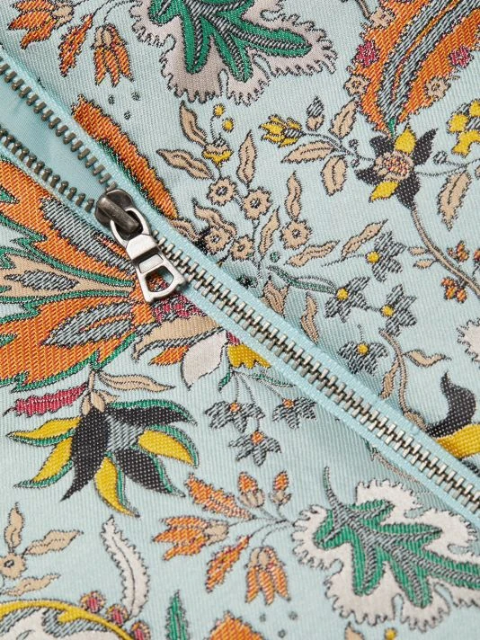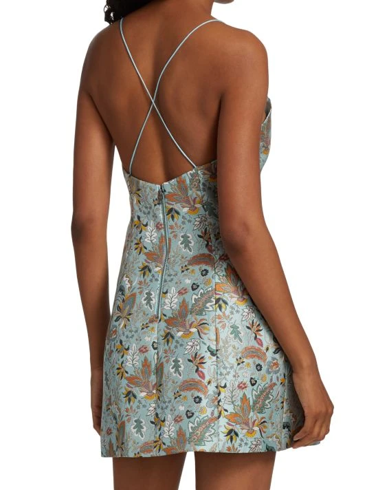 This structured minidress is crafted of paisley jacquard and features crisscross straps at the back.