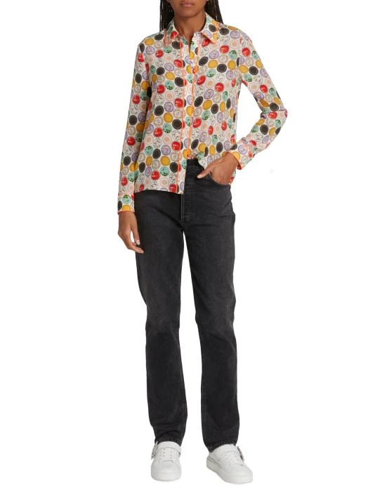 Alice + Olivia’s Willa shirt is adorned with a floral medallion print with contrasting piping.
